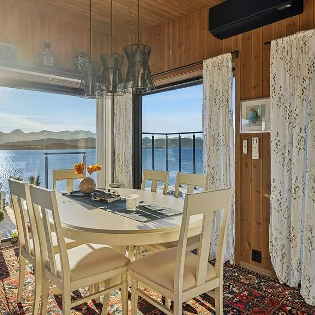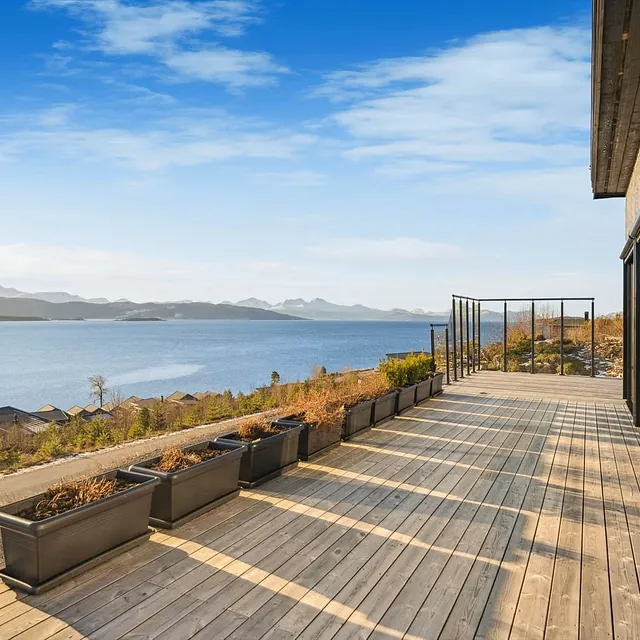 Eiendommen har gode solforhold og panoramautsikt til Karlsøyfjorden og Romsdalsalpene.